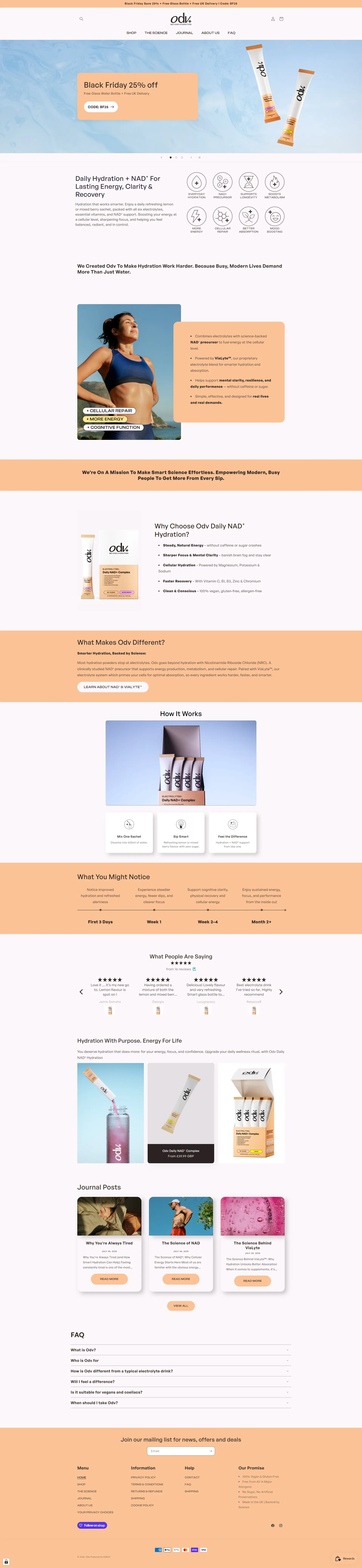 Odv’s design presents complex, science-based hydration information in clear, digestible sections with visuals and headings, making purchase decisions easy and approachable, while offering blogs and educational pages for deeper learning and review sections throughout the site to build trust and social proof.